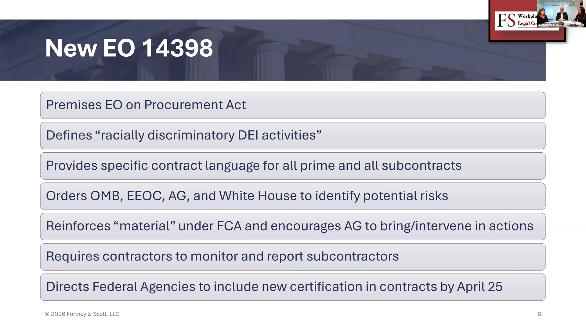President Trump issued a new Executive order ( EO 14398 ) on March 26, 2026, entitled “Addressing DEI Discrimination by Federal Contractors,” and accompanying Fact Sheet . The new EO fundamentally alters the compliance landscape for government contractors. While prior executive orders addressed DEI programs through policy directives, this new EO creates a mandatory, enforceable contract clause that exposes contractors to contract termination, debarment, and False Claims Act (FCA) liability. The Core Requirement: A New Mandatory Contract Clause Within 30 days (by April 25, 2026), agencies must insert a specific clause into all covered contracts, subcontracts, and lower-tier subcontracts. By accepting a contract containing this clause, contractors agree to six binding obligations: 1. The contractor will not engage in any “racially discriminatory DEI activities,” as defined in Section 2 of the Executive Order of March 26, 2026 (Addressing DEI Discrimination by Federal Contractors): 2. The contractor will furnish to contracting agencies all information and reports, including providing access to books, records, and accounts, for purposes of ascertaining compliance; 3. In the event of the contractor’s or a subcontractor’s noncompliance with this clause, the government contract may be canceled, terminated, or suspended in whole or in part, and the contractor or subcontractor may be declared ineligible for further Government contracts; 4. The contractor will report any subcontractor’s known or reasonably knowable conduct that may violate this clause to the contracting department or agency and take any appropriate remedial actions directed by the contracting department or agency; 5. The contractor will inform the contracting department or agency if a subcontractor sues the contractor and the suit puts at issue, in any way, the validity of this clause; and, 6. The contractor recognizes that compliance with the requirements of this clause are material to the Government’s payment decisions for purposes of section 3729(b)(4) of title 31, United States Code (False Claims Act). Immediate Action to Meet Deadlines Federal contractors face very short deadlines for the implementation of these new obligations, including the inclusion of the new contracting clauses within 30 days, by April 25, 2026. Federal contractors should initiate steps immediately to ensure compliance, including: 1. Audit Internal Programs: Review mentorship programs, ERGs, leadership development tracks, and supplier diversity initiatives for eligibility criteria based on race or ethnicity. 2. Update Subcontractor Agreements: Immediately begin flowing the mandatory clause down to all subcontractors and establish a monitoring system to satisfy the “known or reasonably knowable” reporting standard. 3. Review Invoicing and Certifications: Ensure that no compliance certifications or payment requests are submitted if prohibited activities exist. For More Information and Assistance Register now for FortneyScott’s special webinar, Federal Contractors’ New DEI Obligations that will be held on Tuesday, March 31, 2026 from 12:00 noon to 1:00 ET. This special webinar we will address: - Details of the new EO - The specific prohibition on “racially discriminatory DEI activities” in five key areas - The new requirements that add materiality to the contract payments and the expansion of the basis for False Claims Act exposure - New subcontractor management and reporting duties - Penalties and enforcement, including contract cancellation, debarment from future contracts and FCA actions by DOJ - The detailed implementation deadline for actions, including the new contract clauses, FAR Council guidance and agencies compliance report to the White House For more information on how federal contractors can comply with this new EO, contact your FortneyScott’s attorney or email us at info@fortneyscott.com .